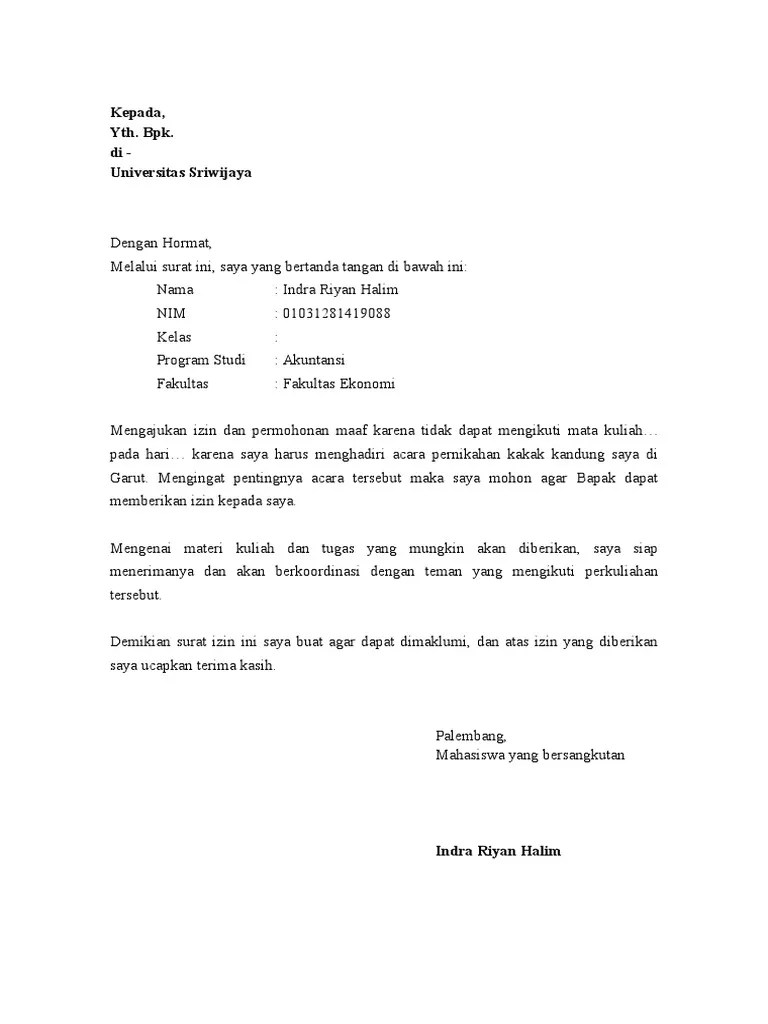 contoh surat izin sekolah smp karena urusan keluarga. contoh surat izin kegiatan ke polisi. Salah satu kewajibannya adalah untuk masuk setiap jadwal mata kuliah sesuai dengan jadwal yang sudah ditentukan. 15 contoh surat izin orang tua lengkap contoh cara membuat dll. Dalam mengirim surat izin tidak masuk kerja pada perusahaan atau instansi tentu saja kita harus menggunakan bahasa dan tulisan yang formal.